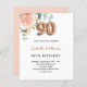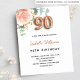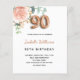 An elegant invitation for a 90th birthday party. A chic white background. Decorated with a rose gold and blush pink watercolored rose flower, floral, green eucalyptus leaves, sprigs, greenery and faux gold sprigs. Personalise and the name and party details. Black and golden letters. The name is written with a modern hand lettered style script. Number 90 is written with a golden balloon style font.