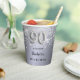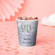 For a glamourous and girly for a 90th birthday party. A faux silver metallic looking background. On the front and the back: Personalise and add a name and a date. Decorated with faux glitter dust.