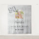 A welcome tapestry for a glamourous 90th birthday party. A faux silver metallic looking background decorated with faux glitter dust. Personalise and add a high quality photo, name and date. Number 90 is written with a balloon style font.