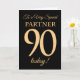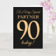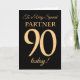 A chic 90th Birthday Card for a 'Very Special Partner', with a number 90 composed of gold-effect numbers and the word 'Partner', in gold-effect, on a black background. The inside message, which you can change if you wish, is 'Happy Birthday'