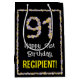This fun, nature-inspired birthday-themed giftbag design has the message “Happy 91st Birthday,” along with a personalised recipient name. The large number “91” and the border both feature flower icons. A gift bag like this might be a fun way of wrapping a birthday present or gift being given to somebody who is celebrating their ninety-first birthday. [~Z0000653]