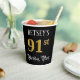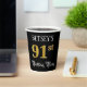 This fancy and opulent birthday-themed paper cup design features a custom name and the message “91st Birthday Party”. The large number “91st” has an imitation/faux gold-inspired coloring pattern, and the words “Birthday Party” are in ornate script-style text. The background is colored black by default (although it can be customized). Luxurious, ornate paper cups like this might be useful to have at a birthday celebration/party being held to celebrate somebody’s 91st birthday. [~Z0000567]