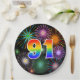 This cheerful, colourful, and fun paper plate design features a large number "91" coloured with a rainbow spectrum gradient inspired pattern. It also features a exciting and vibrant bursting celebratory fireworks inspired pattern. It has a black coloured background. Fun paper plates like this might be used at a celebration being held to honour somebody’s 91st birthday, a 91st anniversary, or some other 91st event. [~Z0000490]