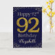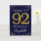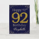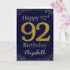 Happy Birthday with simulated golden glitter number 92 set on a solid color and framed by faux diamonds and rhinestones. Happy birthday and recipients name in off-white font. Personalize with name or message.