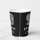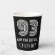 This 1920s-1930s style inspired and vintage style birthday themed paper cup design features a large art deco inspired appearance number “93”, along with the birthday greeting message “Happy 93rd Birthday,” and a personalised name. It also has a black-coloured background. Paper cups like this might be used when celebrating somebody’s ninety third birthday. [~Z0000542]