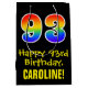 This fun, exciting, and colourful birthday-themed gift bag design features a large number "93" with a rainbow spectrum gradient style pattern, along with the message "Happy 93rd Birthday,", and a personalised recipient name. It also has a black-coloured background. A birthday themed gift-bag like this might be a fun way to wrap a gift or present being given to celebrate somebody’s ninety third birthday. [~Z0000512]