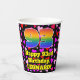 This fun and colourful birthday paper cup design features a large number “93” having a rainbow spectrum gradient inspired pattern. It also features the message “Happy 93rd Birthday,”, and an editable name. The background features a pattern of heart shapes with colours like red, purple, and pink. Loving, upbeat paper cups like this might be fun to have at a birthday celebration/party being held to honour somebody’s 93rd birthday. [~Z0000548]