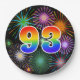 This fun, cheerful, and colourful paper plate design features a large number "93" containing a rainbow spectrum gradient inspired pattern colouring. It also features a exciting and vibrant bursting celebratory fireworks inspired pattern. It has a black coloured background. Paper plates like this might be used when celebrating somebody’s 93rd birthday, a 93rd anniversary, or some other 93rd event. [~Z0000490]