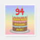 This upbeat and joyful birthday paper napkin design features a cartoon-style depiction of a three-tier birthday cake having numeral-shaped candles on top showing the number “94“, along with the message “HAPPY 94TH BIRTHDAY,”, and an editable recipient name. The background has a multicolored pastel rainbow spectrum inspired gradient pattern. Fun birthday themed paper napkins like these might be used at a party celebrating somebody’s 94th birthday. [~Z0000623]