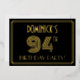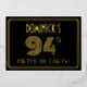 The front of this vintage-look ninety-fourth birthday party/celebration foil invitation features a custom name, a large art deco look inspired number “94TH”, the message “BIRTHDAY PARTY!”, and a border pattern consisting of lines. There is a black-coloured background on the front by default, but it can be customised to a different colour if desired. The back features personalised details about the event, such as the date, time, location, and any other information that may be relevant. Luxurious, elegant, editable invitations like these might be used to invite guests to a birthday celebration/party being held in celebration of somebody’s 94th birthday. [~Z0000590]
