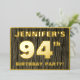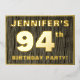 The front of this bold ninety-fourth birthday celebration foil invitation card features a personalised name, a large number “94th”, the message “BIRTHDAY PARTY!”, and a border, all in foil. There is a rustic, yet elegant, faux wood grain look inspired pattern for the background of the front. The back features personalised details about the event, such as the date, time, venue, and any other relevant information. Customised invitations like these might be used to invite guests to a birthday gathering being held to celebrate somebody’s 94th birthday. [~Z0000598]
