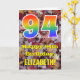 The front of this colourful, autumn-themed, and rustic birthday greeting card design features a large number "94" with a rainbow spectrum gradient inspired pattern, along with the message "Happy 94th Birthday,", and an editable name. The front features a background depicting rustic fallen autumn leaves. The inside features a customisable birthday greeting message, or could perhaps be cleared and left blank if a message is to be written by hand instead. A customisable birthday card like this might be a fun way to send birthday wishes to somebody who is celebrating their ninety fourth birthday. [~Z0000384]