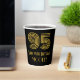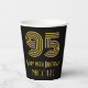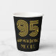 This vintage look and 1920s-1930s style inspired birthday themed paper cup design features a large art deco inspired look number “95”, plus the birthday greeting message “Happy 95th Birthday,” and a personalized name. The background is colored black. Birthday themed paper cups like this might be used at a party celebrating somebody’s 95th birthday. [~Z0000546]