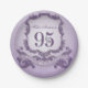 Customisable 95th Birthday Celebration paper plate with a large number (not customisable) into vintage frame and ribbon (Birthday celebration: not customisation). Only name is customisable. You can easily change text colour, font, size and position by clicking the customise button.