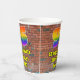 This vibrant and exciting urban graffiti and street art inspired birthday paper cup design features a large number “96” with a colourful rainbow spectrum gradient inspired pattern, along with the message “Happy 96th Birthday,”, and a customisable name. The background features a brick wall pattern. Vibrant, colourful paper cups like this might be fun to use at a birthday party/celebration being held to honour somebody’s 96th birthday. [~Z0000543]