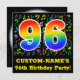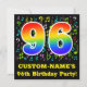 The front of this fun, vibrant, and colourful birthday party invitation design features a large number "96" having a rainbow spectrum gradient inspired pattern. It also features a personalised name and the message "96th Birthday Party!". Part of the background has a fun pattern of various music notes and symbols having a variety of colours and sizes. The back features personalised information/details about the event that the potential guests are being invited to. Vibrant, customisable birthday celebration invitation cards like this might be sent to potential guests of a celebration being held to celebrate a singer’s, a musician’s, a song composer’s, or somebody else’s ninety sixth birthday. [~Z0000427]