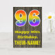 The front of this colorful yet rustic birthday greeting card design features a large number "96" having a rainbow spectrum gradient inspired pattern. It also features the message "Happy 96th Birthday,", and a personalized recipient name. The background of the front of the card features a rustic faux wood grain appearance pattern. The inside features an editable birthday greeting message, or could perhaps be cleared and left blank if a message is to be written by hand instead. A personalized birthday card like this might be a fun way to send birthday wishes to somebody who is celebrating their ninety sixth birthday. [~Z0000419]