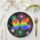 This colourful, cheerful, and fun paper plate design features a large number "96" having a rainbow spectrum gradient inspired pattern colouring. It also features a vibrant and exciting bursting celebratory fireworks inspired pattern. It has a black coloured background. Paper plates like this might be fun to use at a party being held to celebrate somebody’s ninety sixth birthday, a ninety sixth anniversary, or some other 96th event. [~Z0000490]