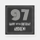 This vintage appearance birthday-themed paper napkin design features a large Art Deco look inspired number "97", the message "HAPPY 97th BIRTHDAY,", a custom name, and a border pattern consisting of lines. Fun, personalised paper napkins like this might be used at a birthday party being held to celebrate somebody’s ninety seventh birthday. [~Z0000395]