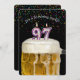Number 97 candle in mug of beer with colourful confetti on black for 97th birthday party invite.