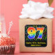 This fun, colourful, and vibrant birthday sticker design features a large number "97" having a rainbow spectrum gradient inspired pattern. It also features the message "Happy 97th Birthday,", and a personalised name. Part of the background has a colourful music notes and symbols pattern. Fun, editable birthday stickers like this might be used as a birthday celebration decoration, or perhaps given as a birthday present, or perhaps be used when wrapping birthday gifts being given to celebrate a singer’s, a song composer’s, a musician’s, or somebody else’s 97th birthday. [~Z0000423]