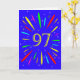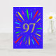 An explosive 97th birthday card! What a wonderful way to send birthday greetings. The number 97 in bright yellow with an explosion of bright colours and stars.