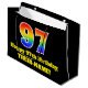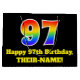 This vibrant and fun birthday-themed gift-bag design features a large number "97" having a rainbow spectrum gradient inspired pattern. It also features the message "Happy 97th Birthday,", and a customisable name. It also has a black-coloured background. A colourful birthday themed gift-bag like this might be a fun way to wrap a gift or present being given to somebody who is celebrating their 97th birthday. [~Z0000521]