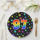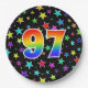 This cheerful, colourful, and fun paper plate design features a large number "97" containing a rainbow spectrum gradient inspired pattern. The background features a pattern of colourful star shapes. Paper plates like this might be used when celebrating somebody’s 97th birthday, or a couple’s ninety seventh anniversary, or some other ninety seventh event. [~Z0000493]