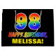 This fun, cheerful, and colourful birthday-themed gift bag design features a large number "98" and the message "HAPPY BIRTHDAY,", both having a rainbow spectrum gradient inspired pattern colouring, along with a bold yellow custom recipient name. The background is coloured black. A fun gift bag like this might be used when wrapping gifts being given to somebody in celebration of their ninety eighth birthday. [~Z0000477]