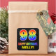 This fun, colourful, and cheerful birthday themed sticker design features a large number "98" and the message "HAPPY BIRTHDAY,", both coloured with a rainbow spectrum gradient inspired pattern, along with a bold yellow custom name. The background is coloured black. Fun stickers this might be used when wrapping a gift or present in honour of somebody’s 98th birthday, or perhaps might be given out to the attendees at a birthday celebration. [~Z0000480]