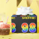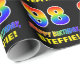 This cheerful, fun, and colourful birthday themed wrapping paper design features a large number "98" and the message "HAPPY BIRTHDAY,", both having a rainbow spectrum gradient inspired pattern colouring, along with a bold yellow personalised recipient name. The background is coloured black. Fun wrapping paper like this might be used when wrapping gifts being given to somebody in celebration of their 98th birthday. [~Z0000475]