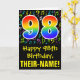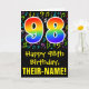 The front of this fun, colorful, and vibrant birthday-themed greeting card design features a large number "98" having a rainbow spectrum gradient inspired pattern. It also features the message "Happy 98th Birthday,", and a personalized recipient name. The front also has a pattern of various music notes and symbols having a variety of colors and sizes. The inside features an editable birthday greeting message, or could perhaps be cleared and left blank if a message is to be written by hand instead. A customizable birthday card like this might be a fun way to celebrate somebody’s ninety eighth birthday. [~Z0000420]