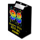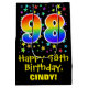 This exciting, vibrant, and colourful birthday themed gift bag design features a large number "98" with a rainbow spectrum gradient style pattern, along with the message "Happy 98th Birthday,", and a custom recipient name. It also has a background pattern featuring star shapes of various sizes and colours. A birthday themed gift bag like this might be a fun way to wrap a gift or present being given to somebody who is celebrating their 98th birthday. [~Z0000510]