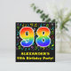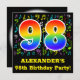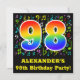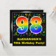 The front of this fun, exciting, and vibrant birthday party invitation design features a large number "98" with a rainbow spectrum gradient inspired pattern, along with an editable name and the message "98th Birthday Party!". Part of the background features a fun and colourful music notes and symbols pattern. The back features customisable details/information pertaining to the event that the potential guests are being invited to. Vibrant, editable birthday party invitation cards like this might be sent to potential guests of a gathering being held to honour a singer’s, a song composer’s, a musician’s, or somebody else’s ninety eighth birthday. [~Z0000427]