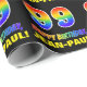 This fun, cheerful, and colourful birthday-themed wrapping paper design features a large number "99" and the message "HAPPY BIRTHDAY,", both having a rainbow spectrum gradient inspired pattern colouring, along with a bold yellow editable recipient name. The background is coloured black. Fun birthday themed wrapping paper like this might be used when giving a gift or present in celebration of somebody’s ninety ninth birthday. [~Z0000475]