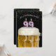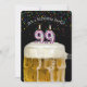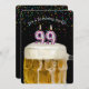 Number 99 candle in mug of beer with colourful confetti on black for 99th birthday party invite.