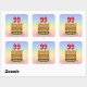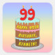 This upbeat and cheerful birthday square sticker design features a cartoon-style depiction of a three-tier birthday cake having number-shaped candles on top showing the age “99“, along with the message “HAPPY 99TH BIRTHDAY,”, and a personalised recipient name. The background has a multi-colour pastel rainbow spectrum inspired gradient pattern. Fun birthday themed stickers like these might be used or distributed at a party for somebody who is celebrating their ninety ninth birthday, or perhaps used when preparing invitations or wrapping presents for such an event. [~Z0000624]