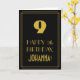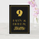 This vintage/retro look and Roaring '20s era inspired birthday themed greeting card design features a large art deco look inspired number "9", the message "HAPPY 9th BIRTHDAY,", an editable name, and a border pattern consisting of thin lines on the front. The background of the front is coloured black. The inside has a custom birthday greeting message, or could perhaps be cleared and left blank if a message is to be written by hand instead. A customisable birthday greeting card like this might be sent in celebration of somebody’s ninth birthday. [~Z0000499]