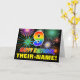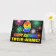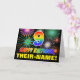 The front of this fun, cheerful, and colourful birthday themed greeting card design features a large number "9" and the message "HAPPY BIRTHDAY,", both coloured with a rainbow spectrum gradient inspired pattern, along with a bold yellow editable recipient name. The front also has a multicolored background pattern inspired by the appearance of bursting celebratory fireworks. The inside features a customised birthday greeting message, or could perhaps be cleared and left blank if a message is to be written by hand instead. A vibrant personalised birthday card like this might be a fun way of acknowledging somebody’s ninth birthday. [~Z0000471]
