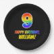 This fun, cheerful, and colourful birthday-themed paper plate design features a large number "9" and the message "HAPPY BIRTHDAY,", both coloured with a rainbow spectrum gradient inspired pattern, along with a bold yellow personalised name. It has a black coloured background. Fun, personalised birthday themed paper plates like this might be used at somebody’s 9th birthday party. [~Z0000488]