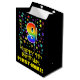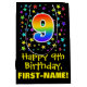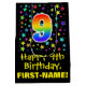 This vibrant, fun, and exciting birthday giftbag design features a large number "9" with a rainbow spectrum gradient inspired pattern, along with the message "Happy 9th Birthday,", and a customisable recipient name. It also has a background pattern featuring star shapes of various sizes and colours. A fun gift bag like this might be used when wrapping presents being given to somebody in celebration of their 9th birthday. [~Z0000510]