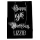 This elaborate and formal birthday themed gift bag design features the message “Happy 9th Birthday,” in opulent script style text, on a black coloured background. It also has a personalised recipient name. A gift bag like this might be used when giving a gift or present in honour of somebody’s ninth birthday. [~Z0000557]