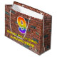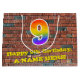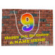 This colourful and fun birthday themed gift bag design, inspired by street art, features a large number "9" having a rainbow spectrum gradient inspired pattern. It also features the message "Happy 9th Birthday,", and a customisable name. It also has a brick wall style pattern background. A giftbag like this might be used when wrapping gifts being given to somebody in celebration of their ninth birthday. [~Z0000522]