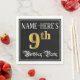 This luxurious and elegant birthday-themed paper napkin design features a custom name and the message “9th Birthday Party”. The large number “9th” has a faux/imitation gold-inspired colouring pattern, the words “Birthday Party” are in fancy script-style text, and the background is coloured black by default (although it can be customised). Fancy, ornate paper napkins like this might be useful at a birthday celebration/party being held to honour somebody’s 9th birthday. [~Z0000565]