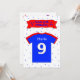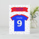This starry 9th birthday party invitation, great for both boys and girls, is ready for your personalised text. The message on the large red birthday banner is "Come to my 9th birthday party". There is also a red and blue sports-style shirt on the front of the card, with a large white number 9 and space for a name. On the reverse of the card you can enter details of the party.