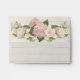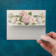 A2 4 1/4" x 5 1/2" Custom designed two-sided preprinted return address envelopes to use for your RSVP return cards that match the wedding invitation, bridal shower party and rehearsal dinner invitations in this set. PLEASE NOTE: THESE TAKE 3-4 WEEKS TO HAND MAKE SO ALLOW ENOUGH TIME TO RECEIVE THE ENVELOPES BEFORE SENDING OUT INVITATIONS. The background is a faded, worn, distressed barn wood fence background with a floral border both inside the envelope and on the back flap. There are pink and creamy white roses, rose buds and pink hydrangeas with mint green succulent leaf foliage for a modern, pretty and classy style. Hand painted by Audrey Jeanne Roberts, copyright, all rights reserved.