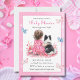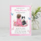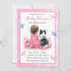 Girl's baby shower invitations. Sweet baby girl sitting next to her little black and white Mini Aussie puppy dog in a patch of pretty watercolor flowers. Pink and blue butterflies and pretty wildflowers.