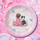 Girl's baby shower personalized paper plates. Sweet baby girl sitting next to her little black and white Mini Aussie puppy dog in a patch of pretty watercolor flowers. Pink and blue butterflies and pretty wildflowers.