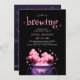 Celebrate the upcoming arrival with a spooky twist using our Halloween Baby Shower Invitation. The front of the invitation features the whimsical text "A Baby is Brewing" set against a dark background. Below the text, an enchanting illustration of a witch's cauldron with pink smoky steam adds a playful and festive touch. The reverse side is adorned with a charming pattern of stars and bat silhouettes, enhancing the Halloween theme.