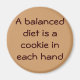 Cute magnet in chocolate chip cookie colours featuring a fun saying...a balanced diet is a cookie in each hand!